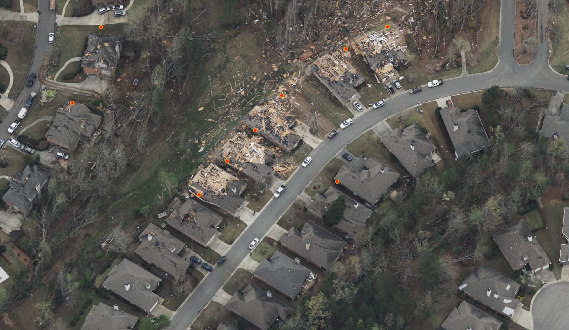 The GIC collected imagery over the tornados that struck Alabama and Georgia this week, and it is now published to our platform. Our web app also has a damage heat map for the regions we have flown that helps spot the worst hit areas. [read more on the heatmap here] You can also import your own property locations with the data import feature to visualize your properties of interest over the imagery and heat map [tutorial on data import]