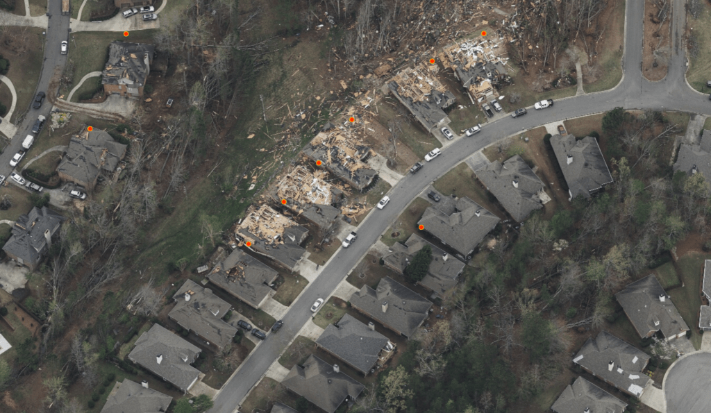 Aerial imagery over the area hit by this weeks tornado in Alabama is live on our platform. Just over 250 square kilometers of imagery, including 45 degree oblique imagery, has been published covering the northern Birmingham suburb of Fultondale. A computer vision generated heat map of the damage is also available to all GIC members in our web app.