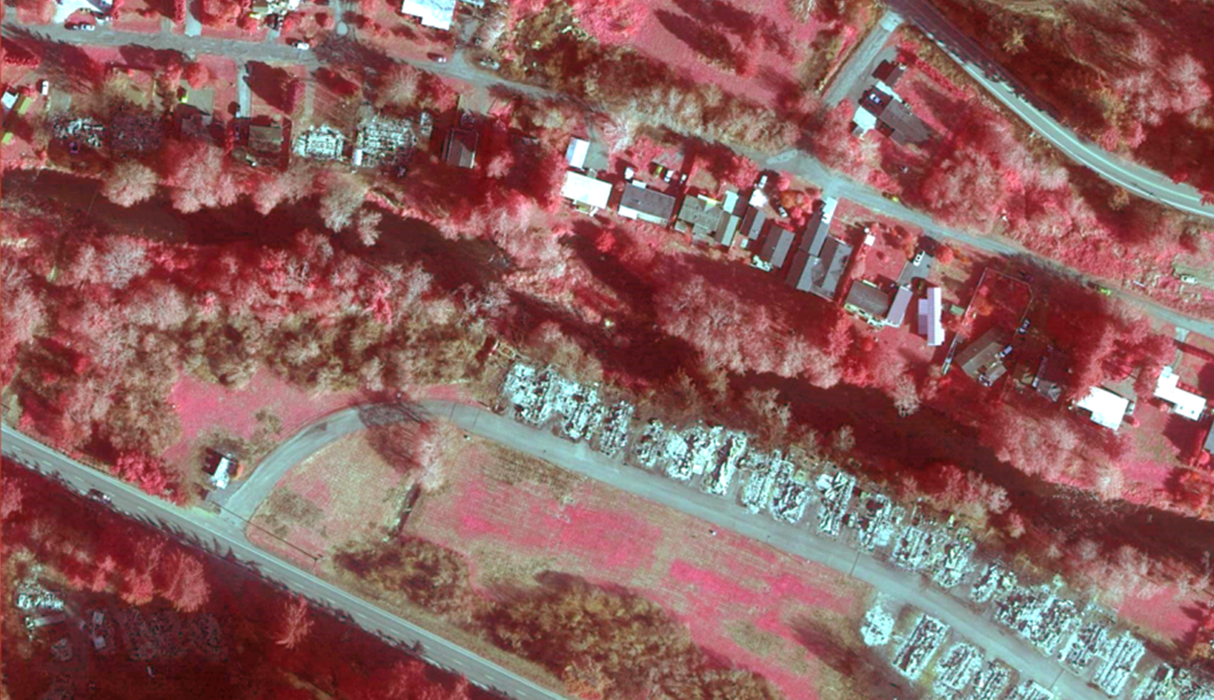Here is another example from our disaster response imagery pulled from the recent Oregon wildfires. we can see with red color healthy trees/grass and with brownish/greyish color tones burnt vegetation. Buildings are also clearly visible. In this case, the CIR is an additional help for the human eye to identify burnt areas.
