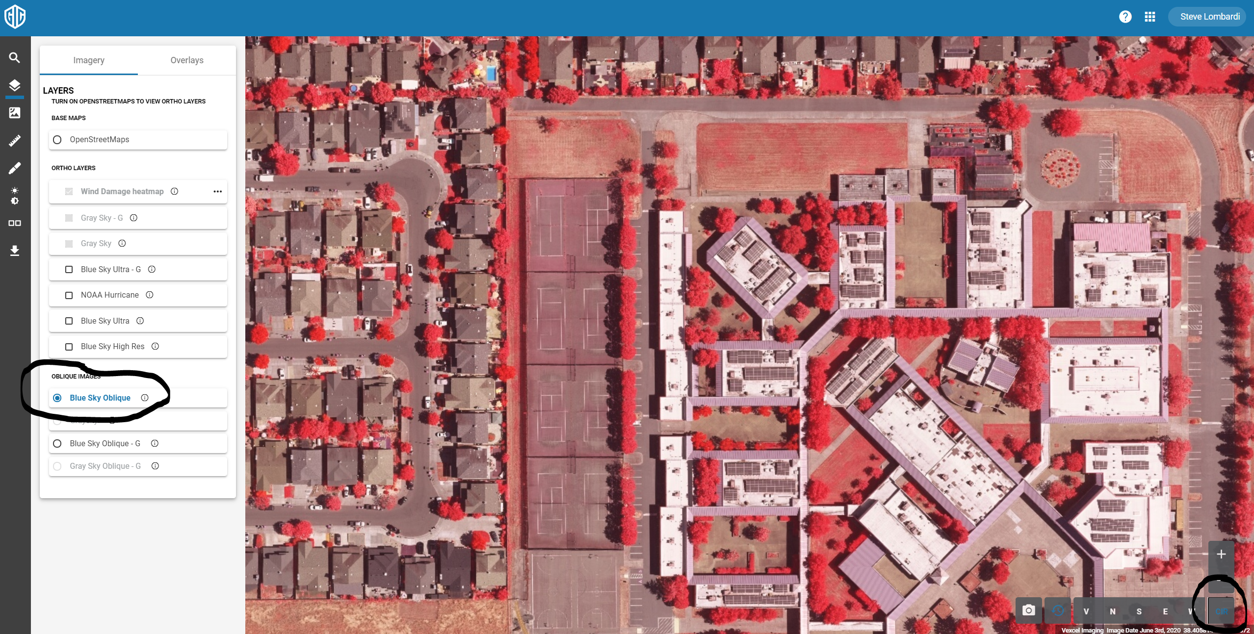 CIR imagery has been available via our API’s for a while now, but this week we introduced this image type into our web application. To access it, go to Oblique mode for the Blue Sky Ultra layer and click the CIR button in the lower right of the screen as shown here: