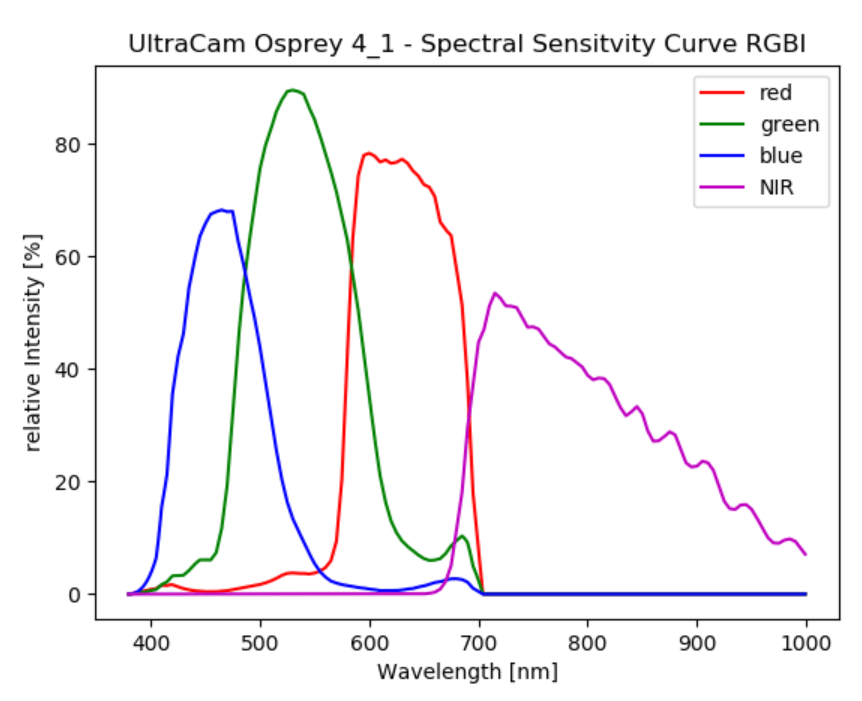 The near-infrared band (NIR) is close to the visible range of the red channel and covers the wavelength from ~670 nm to ~1050 nm. See the graph below for the spectral sensitivity curves for RGBI channels, as we include it in the camera calibration reports for Ultracam Osprey 4.1 (UCO 4.1).