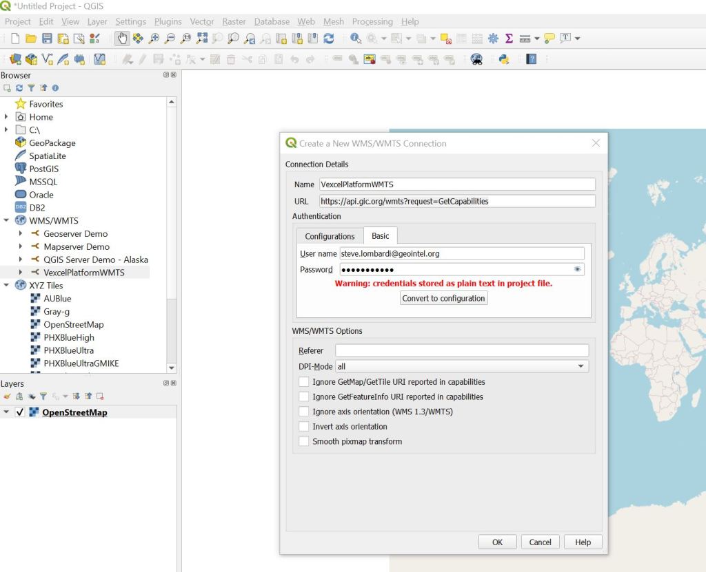 Step 3: Add the Vexcel WMTS Connection. Right Click on the WMS/WMTS section in the left menu and choose ‘New Connection…’. Give your connection a name like ‘VexcelPlatformWMTS’ and specify the URL as ‘https://api.gic.org/wmts?request=GetCapabilities’
