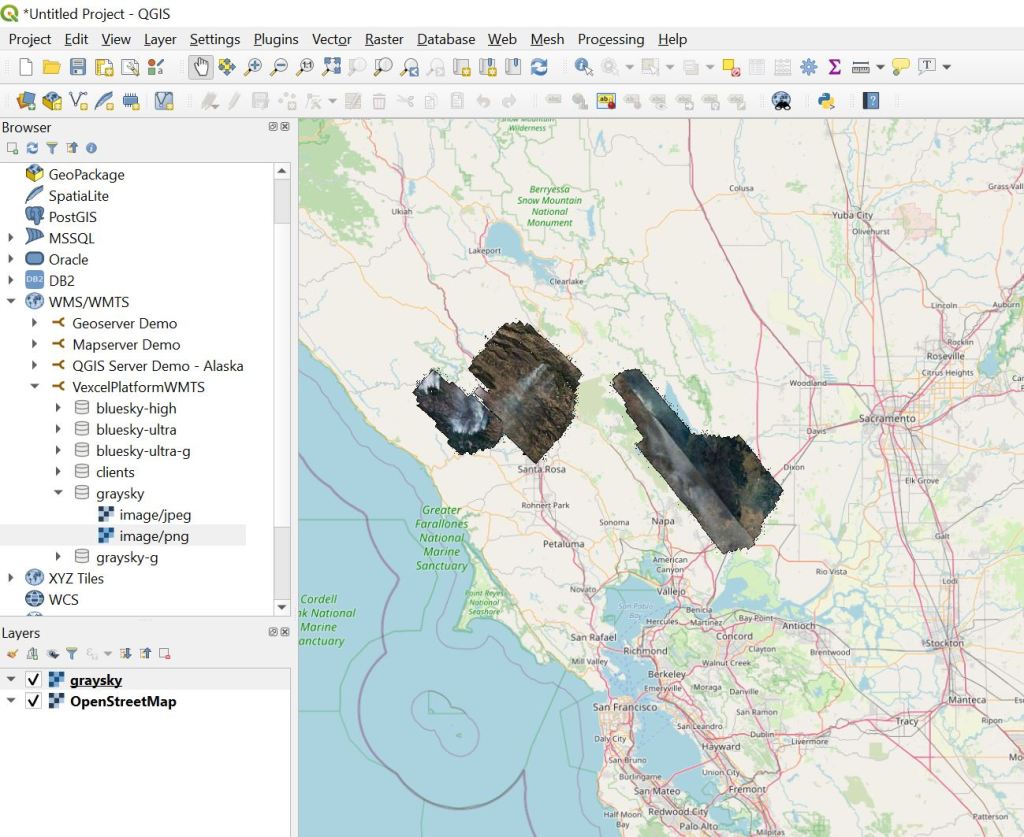 Step 4. Add a Vexcel Layer to the map. Once you’ve added the connection in step 3, all of the Vexcel Layers will appear below it. Double click any of them to expand it, then double-click on the ‘PNG’ option to add the layer to the map. We’re going to add the ‘graysky’ layer to pull in imagery from the California Wildfires. Hurricane Laura Imagery will appear in this layer as well as it becomes available.