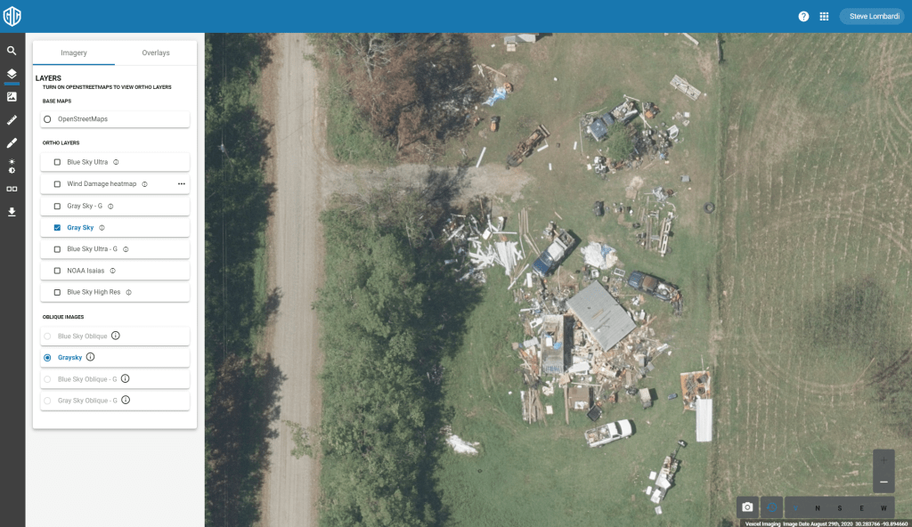 One more thing to understand as you go through this tutorial – ‘Graysky’ refers to our disaster response imagery, typically captured after a hurricane, tornado, wildfire, etc… while ‘Bluesky’ refers to our high quality aerial imagery captured with good weather conditions and sun angle. Our focus in this tutorial is to inspect a property damaged in the wildfires using our Graysky imagery, but then to use the Bluesky imagery to see what it was like before the fires.