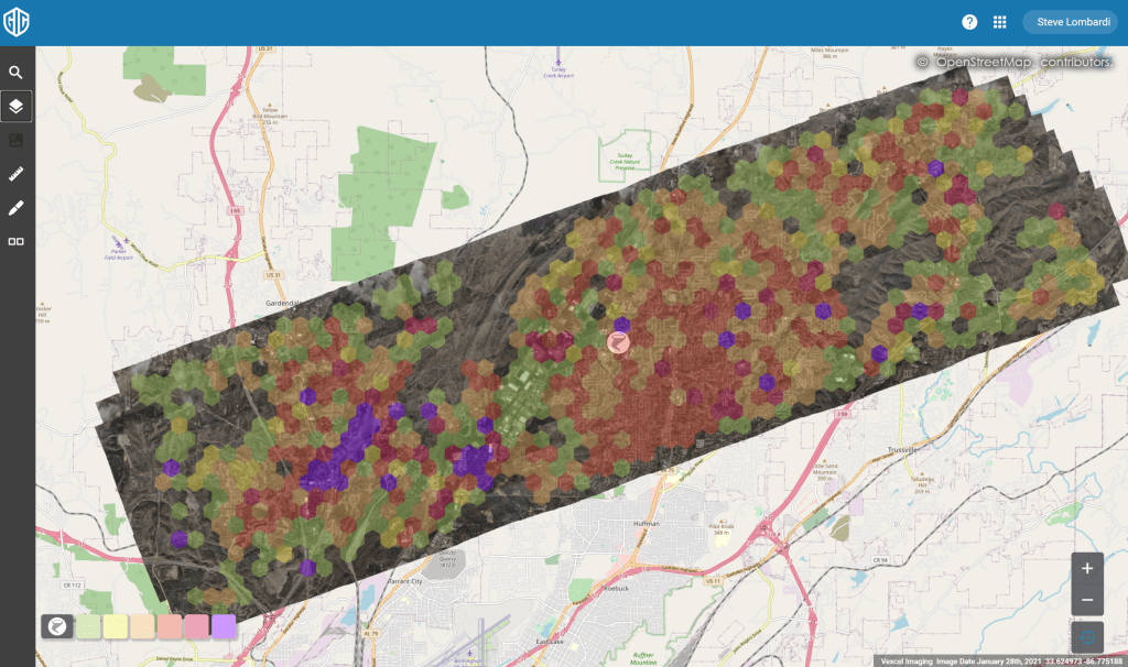 Aerial imagery over the area hit by this weeks tornado in Alabama is live on our platform. Just over 250 square kilometers of imagery, including 45 degree oblique imagery, has been published covering the northern Birmingham suburb of Fultondale. A computer vision generated heat map of the damage is also available to all GIC members in our web app.